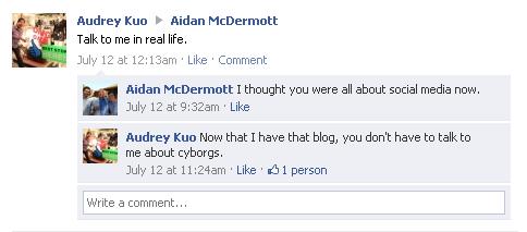 The like is from Aidan's roommate ... who has also heard me talk about cyborgs.